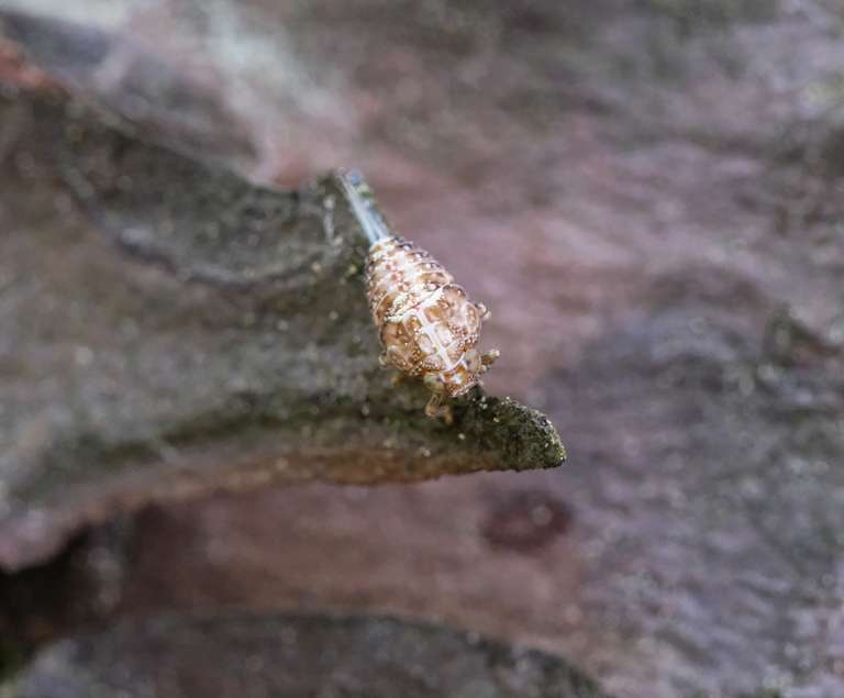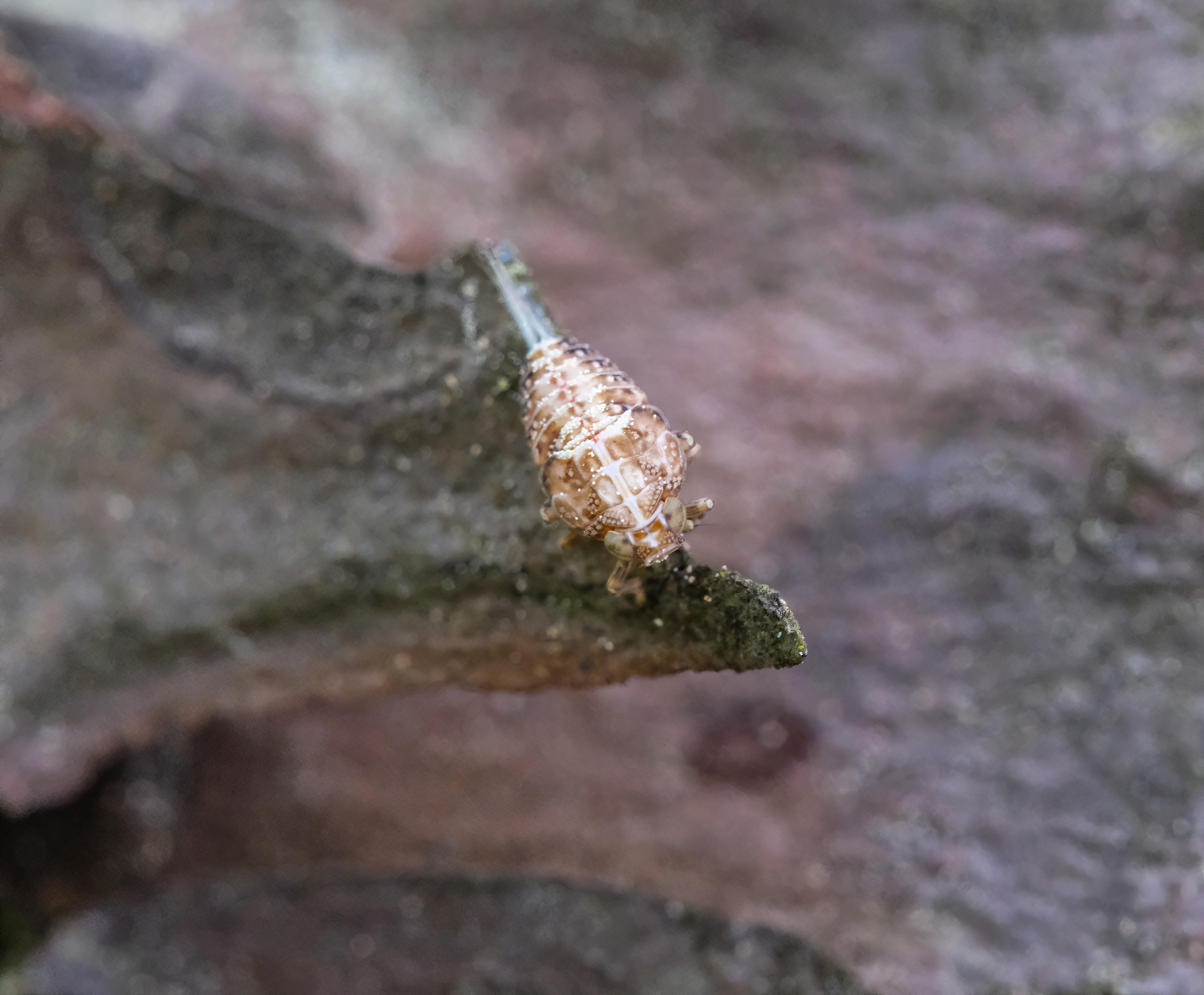 Der Büschel am Hinterleib, den man im Bild nur undeutlich erkennen kann, besteht aus Wachsfäden. Die Larve habe ich Mitte Mai gefunden. Sie überwintern als Junglarven im Bodenstreu, die erwachsenen Tiere findet man dann von Juni bis August auf ihren Futterpflanzen. Erwachsene Zikaden saugen Pflanzensäfte aus unterschiedlichen Baumarten.