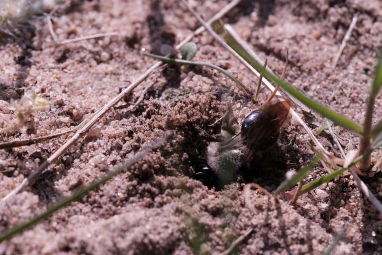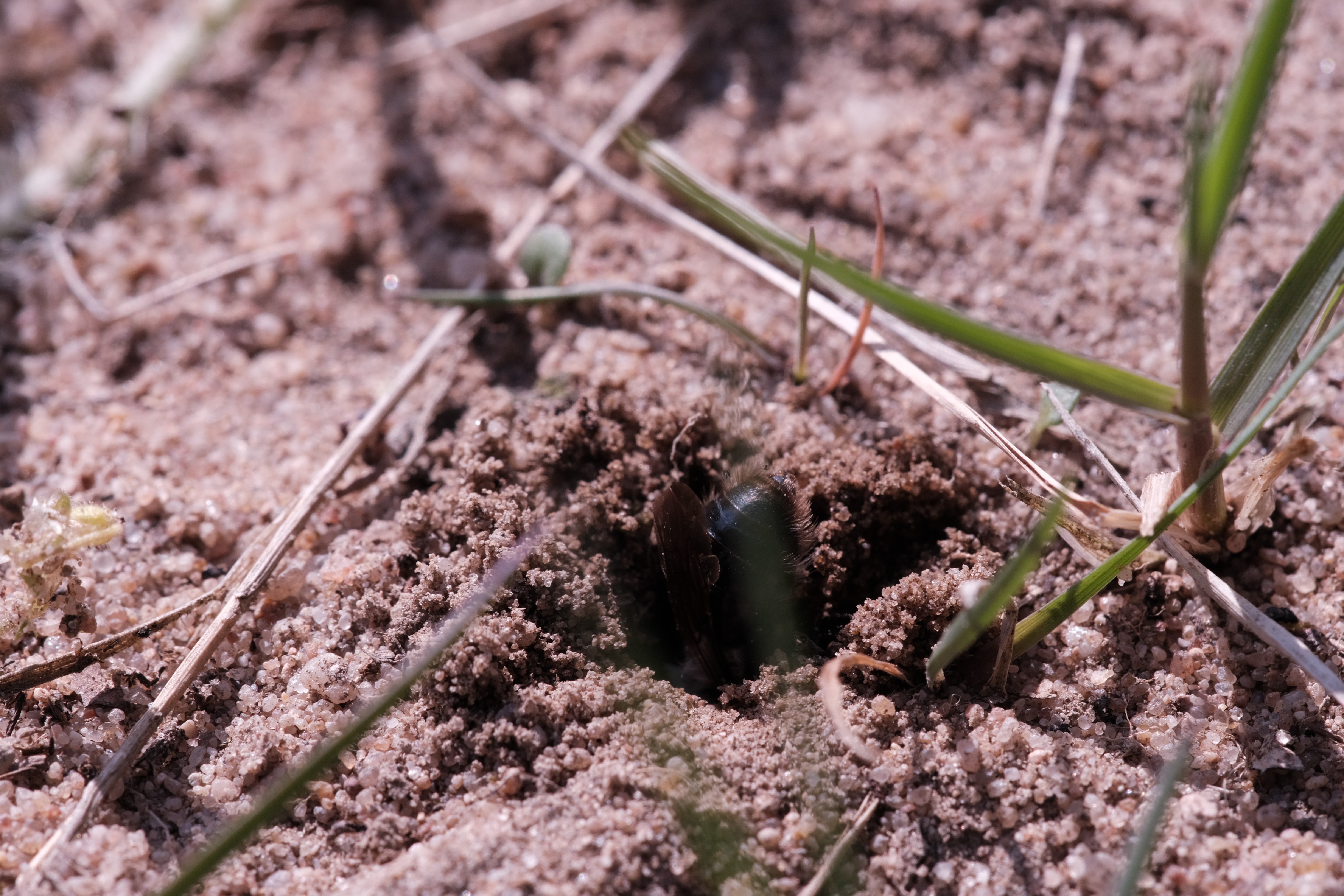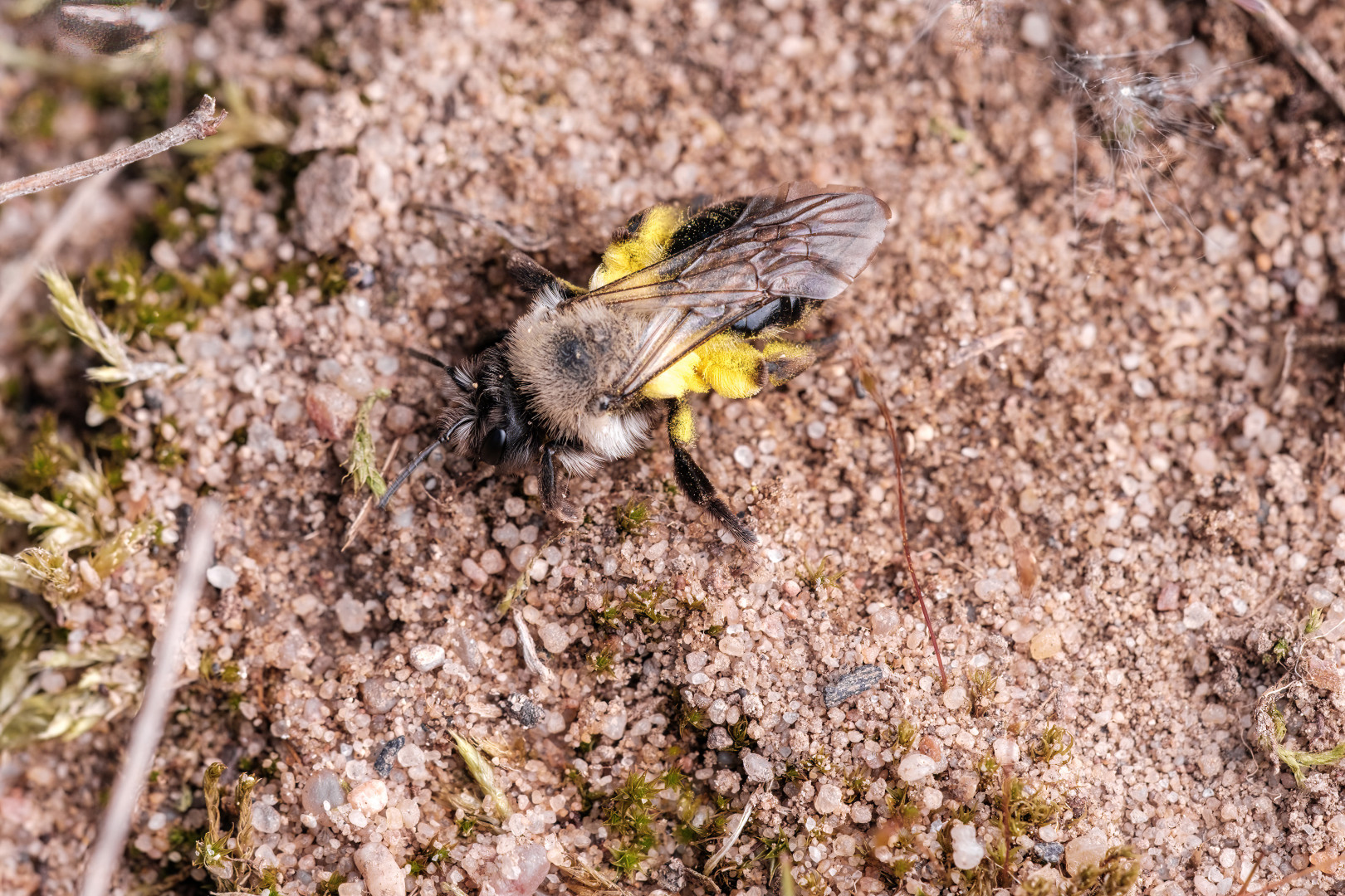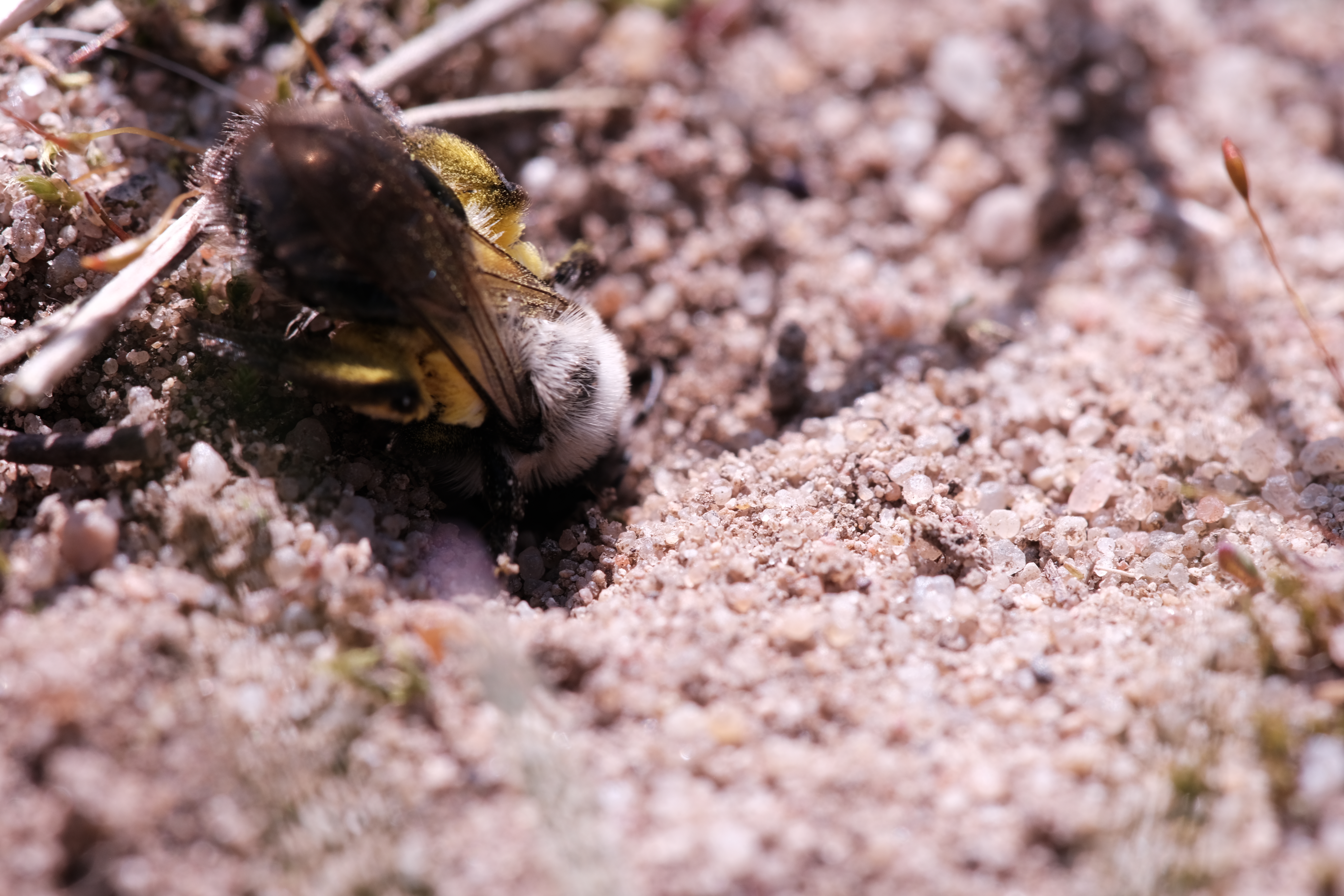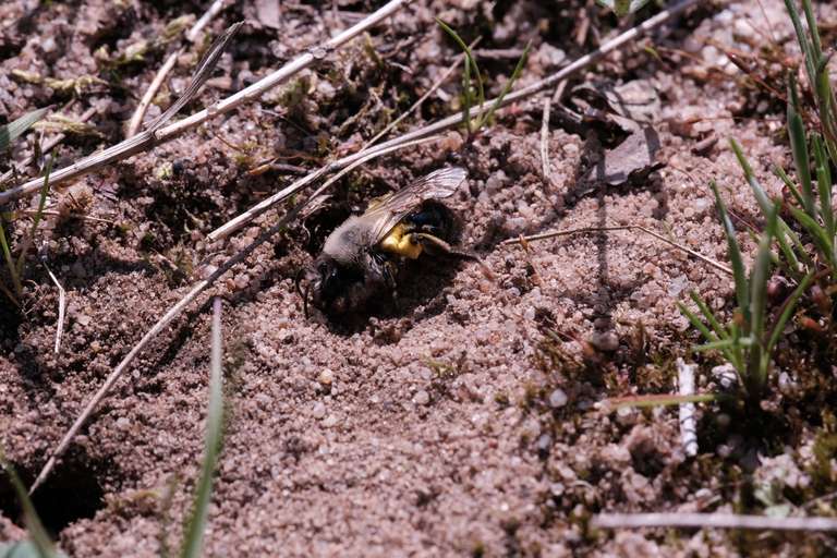 Wie sich herausstellte war es eine Weiden-Sandbiene, die an ihren Hinterbeinen hellgelben Pollen gesammelt hatte. Sie war damit beschäftigt, eine Höhle in den Sandboden zu graben.